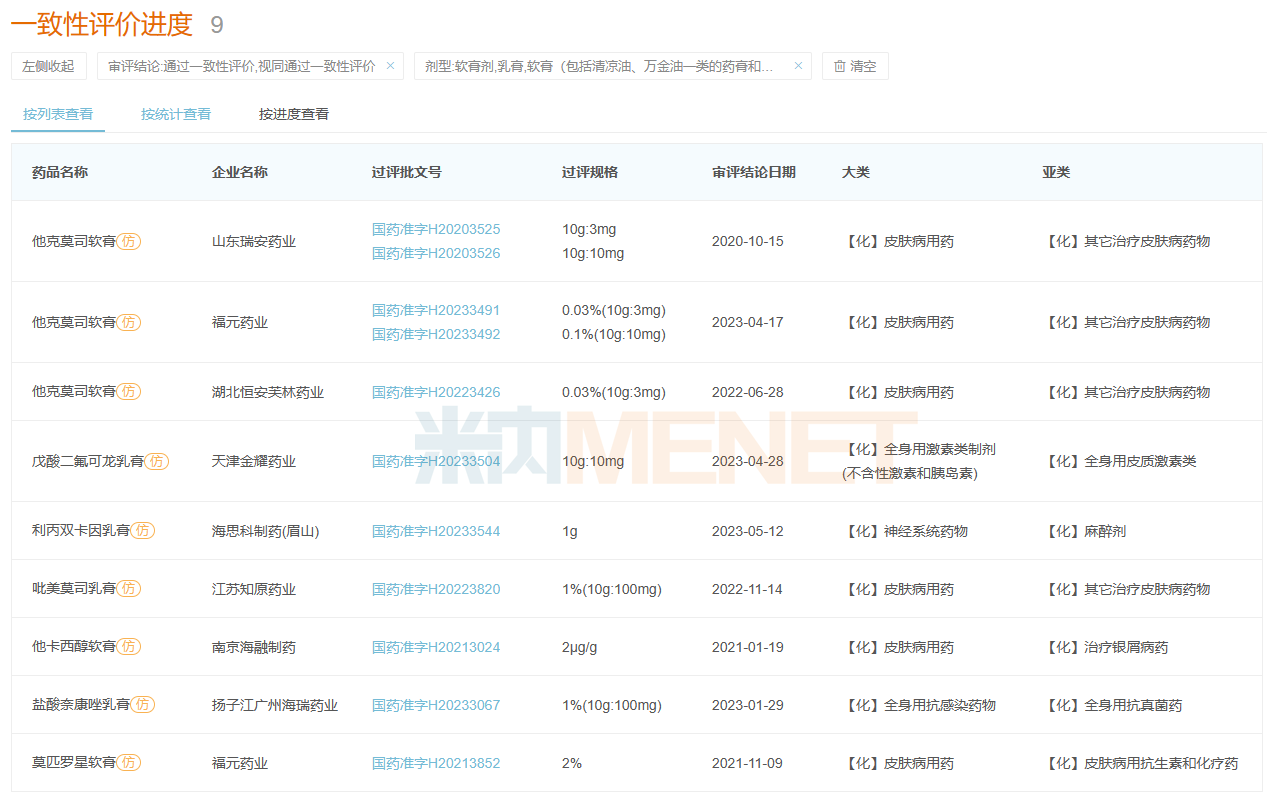 截至目前,软膏剂有7个品种(11个品规)过评,江苏知原药业的吡美莫司乳膏、福元药业的莫匹罗星软膏和南京海融制药的他卡西醇软膏等6个品种均为独家过评。