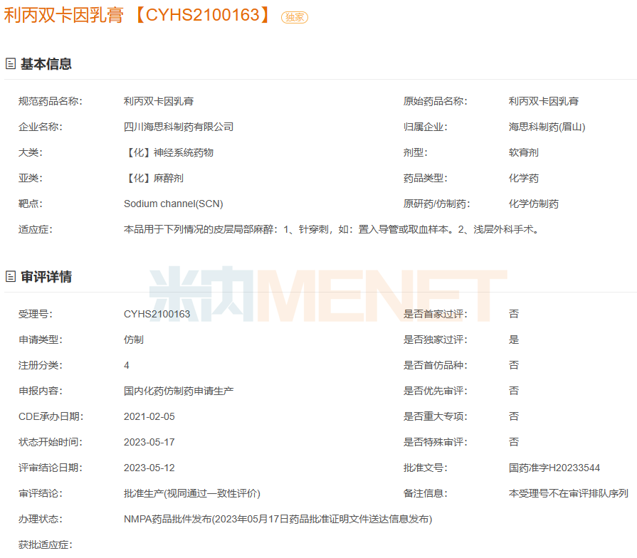 日前,海思科发布公告,其全资子公司四川海思科制药以仿制4类报产的利丙双卡因乳膏获批。该产品尚无其它新4类仿制药上市,公司是视同通过一致性评价上市的首家仿制药企业。