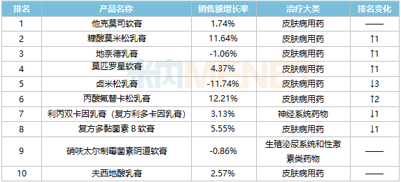 产品TOP10销售额涨多跌少,其中,糠酸莫米松乳膏和丙酸氟替卡松乳膏增速超过10%。从治疗大类来看,皮肤病用药依然占据主流。而产品TOP10中,过评的仅有他克莫司软膏、莫匹罗星软膏和利丙双卡因乳膏。