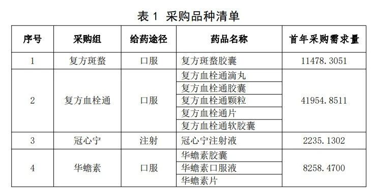 此外,在本次湖北省发布的《采购文件》中,还公开了联盟地区集采的品种以及首年采购需求量(单位:万片/粒/袋/支/丸等)。从品种上看,首年采购需求量最大的心可舒超过8亿片(支/袋/粒/丸),脑安约5.8亿片(支/袋/粒/丸),复方血栓通约4.2亿片(支/袋/粒/丸)。根据公开资料,上述三个品种多应用于慢性病或老年性疾病治疗;首年采购需求量最低的为鸦胆子油乳注射液(抗癌药,用于肺癌、肺癌脑转移及消化道肿瘤),也有605万余支。