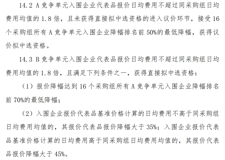 在正式文件的规定下,A组竞争单元入围企业报价代表品申报价计算的日均费用不超过同采购组日均费用均值的1.8倍,且满足下列条件之一,获得直接拟中选资格: